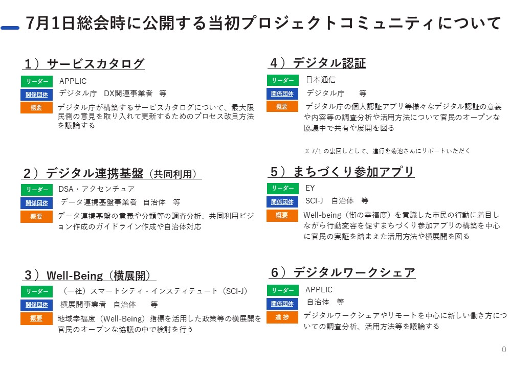 プロジェクトコミュニティは協議会の概要にある「民間提案型の政策決定プロセス」を実現すべく、協議会会員の発案をもとに設置される会員同士の共創の場です。